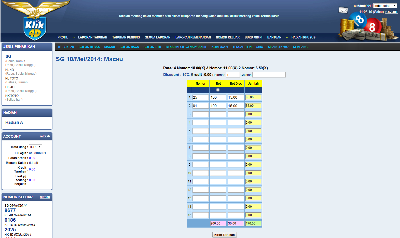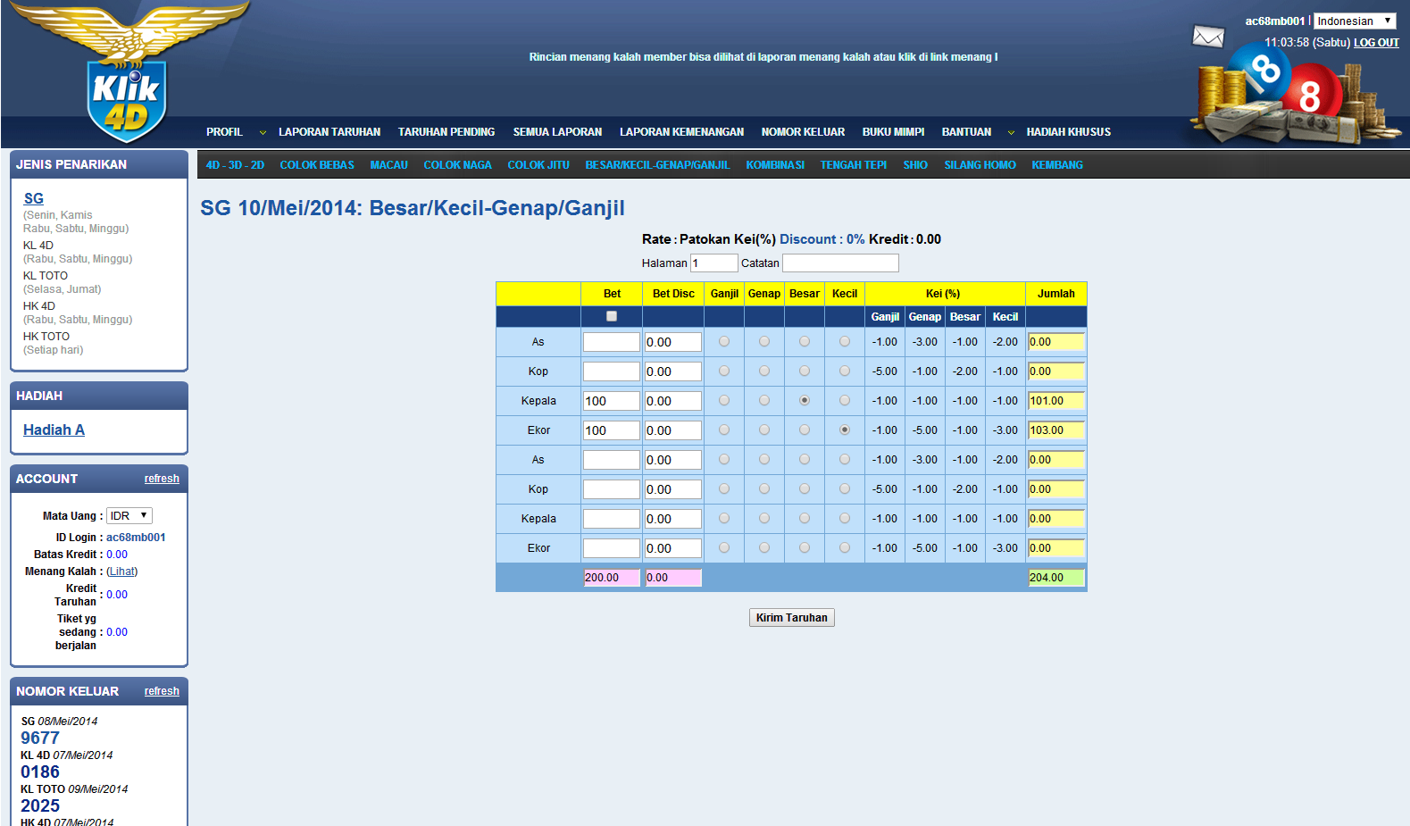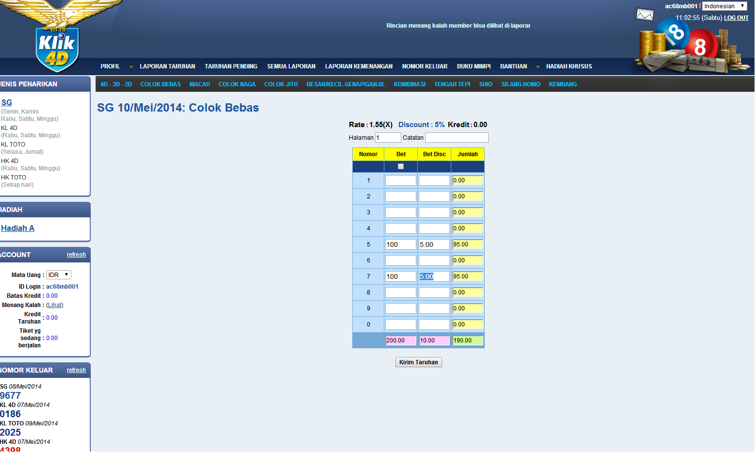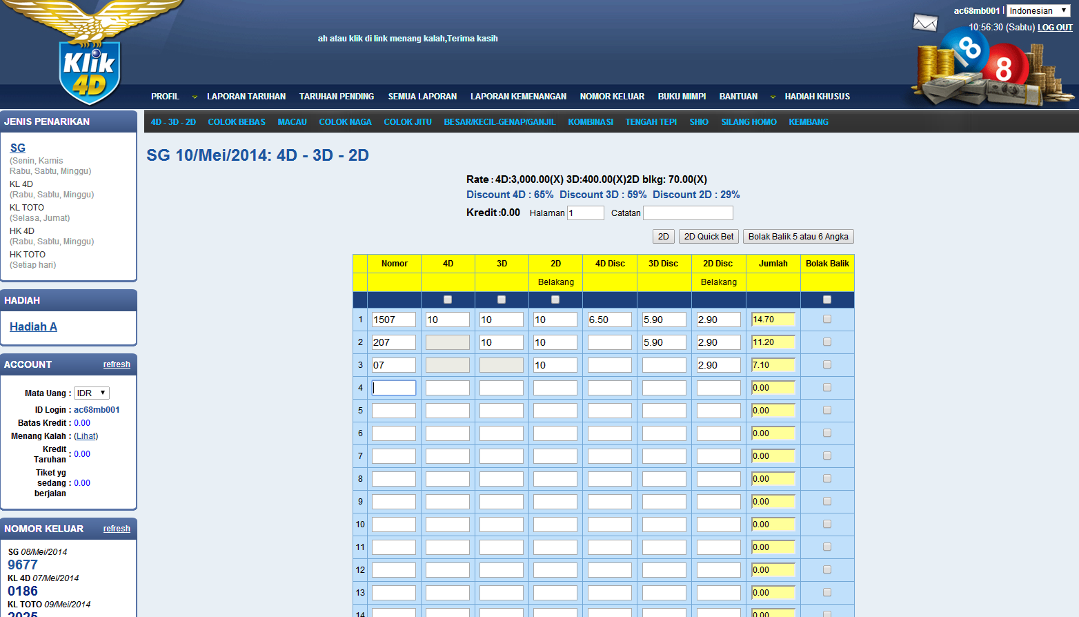 Setelah member memilih Jenis Penarikan yang dihendaki, pastikan di layar tengah muncul Tulisan Jenis Penarikan yang hendak dipilih, Di sini kami memilih jenis Penarikan SG, maka muncul Tulisan : SG 10/ Mei / 2014 – 4D-3D-2D. dan akan muncul table taruhan , dimana anda dapat bertaruh jenis angka yang dikehendaki.