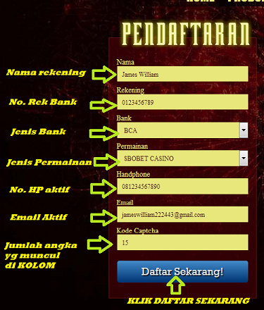 - Isilah setiap kolom yang terdapat di Formulir Pendaftaran Merdekabet secara lengkap dengan data-data seperti Nama / Nomor Rekening / Jenis Bank, Email, Nomor HP